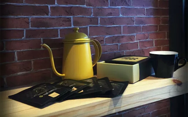 客房內獨辟了一個咖啡角,客房內的咖啡也不是一般酒店的速溶咖啡包,而是成本貴10倍以上的精品掛耳包咖啡。客人可以在咖啡角制作咖啡,享用咖啡,在濃濃的咖啡氛圍中,體驗到像在咖啡館一樣的感覺。